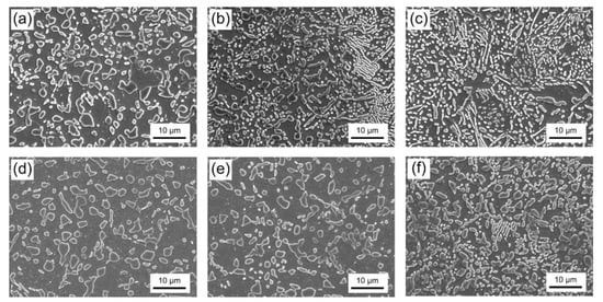 SEM images showing the microstructures in the samples after DET heat treatment at different cooling rates: (a) 950-1, (b) 950-3, (c) 950-5, (d) 900-1, (e) 900-3 and (f) 900-5.