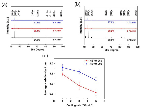 XRD patterns of HSYM steels cooled at different rates and austenitized at 950 °C (a) and 900 °C (b), together with the average size of κ-carbides in the samples austenitized at 950 °C and 900 °C (c).