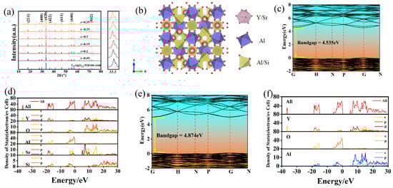 (a) YSAS: xEu3+ (x = 0.05–0.35) phosphor XRD pattern; (b) crystal structure; (c) YAG band structure; (d) density of states of YAG; (e) YSAS band structure; (f) density of states of YSAS.