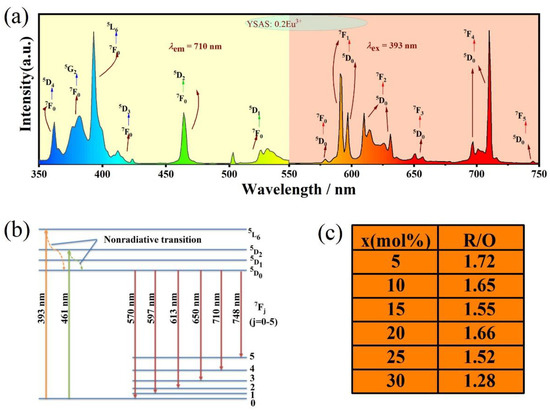 To understand the composition of the sample spectrum, the excitation and emission spectra of the YSAS: 0.2Eu3+ sample were measured, as shown in Figure 3a. At a monitoring wavelength of 710 nm, the excitation spectrum exhibits a series of peak excitations from 350 to 550 nm. Among them, the peaks at 362, 381, 393, 412, 457 and 525 nm correspond to the transitions of Eu3+ from 7F0→5D4, 5G2, 5L6, 5D3, 5D2 and 5D1, respectively [21]. The strongest peak excitation is located at 393 nm, which can be efficiently excited by the near-ultraviolet chip. Under the most intense excitation at 393 nm, the emission spectrum of the sample consists of a series of peak emission from 550 to 750 nm. Among them, the sharp peaks at 578, 590, 612, 650, 710 and 748 nm originate from the electronic transition of Eu3+ from 5D0→7Fj (j = 0–5), respectively. According to the excitation and emission spectra of YSAS: Eu3+ phosphors, the energy level transition diagram of Eu3+ in the host YSAS is drawn, as shown in Figure 3b. Under excitation at 393 and 461 nm, electrons can absorb energy transitions from the ground state (7F0) to the higher energy 5L6 and 5D2 excited levels. Due to the presence of nonradiative transitions, the higher state of the two energy levels to the lower 5D0 energy level via a relaxation transition. Subsequently, the electrons at the 5D0 level release energy in the form of photons to return to the 7Fj (j = 0–5) ground state. It is worth noting that 5D0→7F1 of Eu3+ belongs to the magnetic dipole transition and is not easily affected by the crystal field environment around Eu3+, while 5D0→7F2 belongs to the electric dipole transition, and the emission intensity is greatly affected by the crystal field environment where Eu3+ is located. It is well-known that the symmetry of the luminescent site of Eu3+ can be measured by the ratio of the emission intensity (5D0→7F2)/(5D0→7F1) (the so-called R/O ratio). If the ratio R/O is less than one, it means that Eu3+ is in symmetry surroundings. If the ratio is greater than one, it indicates an asymmetric structure [22,23,24]. The phosphor YSAS in this paper: Eu3+, 5D0→7F1 and 5D0→7F2 transitions are located at 597 nm and 613 nm, 630 nm, respectively. It can be seen from Figure 3c that the R/O of all concentrations is greater than one, indicating that Eu3+ is in an asymmetric environment in the host matrix.