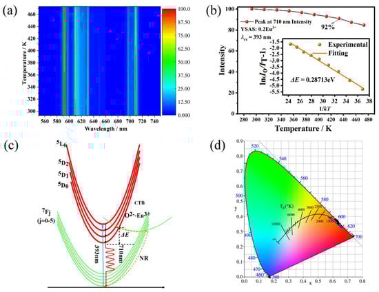 Among them, IT represents the luminescence intensity at T temperature, I0 represents the initial luminescence intensity, A is a constant, K is the Boltzmann constant (8.617 × 10−5 eV K−1) and ΔE represents the activation energy of thermal quenching. In the inset of Figure 5b, the relationship between ln(IT/I0 − 1) and 1/kT is plotted, with the negative of the slope being the desired activation energy ΔE, which is 0.28713 eV. Generally, the thermal stability of phosphors is positively correlated with the activation energy [29], so larger activation energy leads to better thermal quenching performance of YSAS: 0.2Eu3+ phosphors. In order to further analyze the thermal quenching mechanism of phosphors, Figure 5c presents the configuration coordinate diagram. Under normal circumstances, after the electrons in the ground state are excited at 393 nm, they transition to the excited state 5L6 and then go to 5D0 through a nonradiative transition and finally, return to the ground state through a radiative transition. With the increase in temperature, the excited electrons will overcome the barrier of activation energy and move to the CTB (charge transfer band transition), and finally, return to the ground state by nonradiative transition, which weakens the emission of Eu3+. YSAS: The CIE chromaticity diagram of xEu3+ (x = 0.05–0.35) series phosphors is calculated under the excitation of 393 nm. It can be seen in Figure 5d that the coordinates of all samples fall in the CIE chromaticity diagram within the red area.