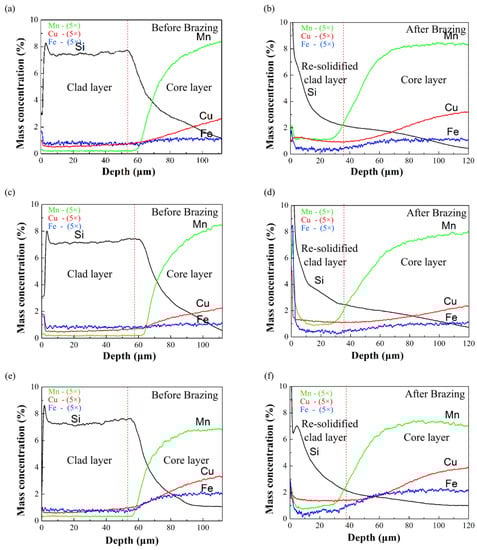 3.4. Element Diffusion between the Core and the Clad during Brazing