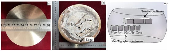 Macroscopic view of cast ingot and near-isothermal forging disk and location of test specimens for forging disk: (a) Cast ingot; (b) Near-isothermal forging disk, (c) location of test specimens for forging disk.