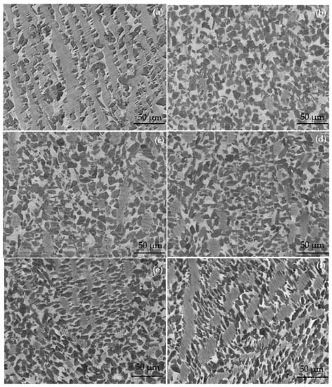 The microstructure of the as-cast three-phase TiAl alloy is illustrated in Figure 2a. The white B2 phase and the black γ phase can be observed with a net basket-like ordered arrangement, and the gray lamellar microstructure distributes between them. In contrast to the typical γ-TiAl alloy, the lamellar colonies of this alloy exhibit a large aspect ratio and an average size of approximately 60 μm, which is consistent with the characteristics of the β-path solidification microstructure. This is mainly due to the β → α transition follows the Burgers orientation relationship and the generated α phase generally grows in a slatted pattern, resulting in the subsequent α2/γ lamellae retaining this morphology [29]. The fraction of the B2 phase is detected as 18.2% by using the IPP image processing software, roughly twice that of the common β-TiAl alloy. This is mostly owing to the comparatively high content of V and Cr addition, with higher β phase stabilization capability than Nb and Mo elements.