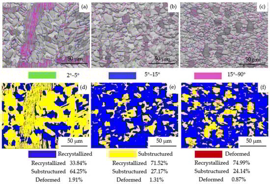 Figure 3 shows the grain boundary angle statistics and recrystallization diagrams at different locations of the forged Ti-40Al-6V-1Cr-0.3Ni alloy. Figure 3a–c depicts the high and low angle grain boundaries of the forged microstructure, where the sub-grain boundaries (2°–5°) are shown in green, representing dislocations in the deformed microstructure; the low-angle grain boundaries (5°–15°) are depicted in blue, resulting from the sub-structural, sub-crystalline transformation of the deformation process; and the high-angle grain boundaries (15°–90°) are described in purple, where the dynamic recovery and dynamic recrystallization occur. The high- and low-angle grain boundaries at different positions are counted in Table 2, and the microstructure at edge is detected as 62.60% high-angle grain boundaries; while the high-angle grain boundaries at center can reach 80.66% due to the larger degree of deformation, which can be attributed to adequate dynamic recrystallization. High-angle grain boundaries characterize the distribution around fine dynamic recrystallization grains. The majority of these fine recrystallization grains are γ-phase grains, which have low stacking fault energy. Moreover, adding a large quantity of V and Cr elements to TiAl alloy will further reduce the stacking fault energy of γ-TiAl [31]. Consequently, dynamic recrystallization of the γ phase occurs readily during hot forging. Due to the dynamic recovery of the α2 phase, lamellar colonies also contain high-angle grain boundaries. Because of the higher stacking fault energy of the α2 phase than the γ and β phases, dynamic recrystallization of the α2 phase is more difficult, and dynamic recovery is the primary softening process for the α2 phase [32]. Low-angle grain boundaries exist primarily in the relatively large size of the γ phase. With the subsequent plastic deformation, some recrystallized grains will continue to deform and generate low angle grain boundaries.