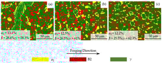 Figure 4 shows the phase analysis of the forged Ti-40Al-6V-1Cr-0.3Ni alloy, as well as the quantification results for each phase at various points after forging. Although the degree of recrystallization and dynamic recovery varies at different positions, this is primarily reflected in the inconsistency of grain size and lamellae size in the final formed microstructure, and the proportion of each phase at different positions does not vary significantly. The lowest proportion of the α2 phase is between 12.2% and 13.1%, the ratio of the B2 phase is between 25.5% and 28.6, and the highest proportion of the γ phase is between 58.3% and 62.3%. The reason for this phase proportion distribution can be mainly attributed to the occurrence of phase decomposition of α2/γ and phase transformation of the β phase [33], i.e., α → β + γ and β → γ, which produces fine equiaxed γ grains. Additionally, some equiaxed γ grains result from the break and recrystallization of coarse γ plates, causing fine γ recrystallization zones to occur at and near the boundary of the lamellar colony. The reduced β phase content at the center is also connected to the transformation of the β phase to the α phase throughout the cooling process [34]. Due to the high V and Cr addition in the present study, the β phase at high temperature is considerably increased, which improves the deformation capability during hot forging [35].