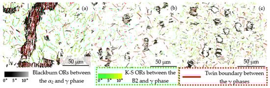 According to the above analysis, the degree of deformation and recrystallization in the edge region is relatively lower. Substructured is the product of grain deformation followed by recovery. According to Figure 3d, 65.25% of the substructured grains are in the edge region, which indicates that the grains suffer a degree of deformation and recovery but maintain a relatively strict orientation relationship between different phases [36]. The γ phase and α2 phase are in the Blackburn orientation relationship (OR), i.e., {111}γ//(0001) α2, [1–10>γ//<11–20>α2, and the OR exists mainly in larger residual lamellar colonies and less in the equiaxed grain region, which is related to the lower volume fraction of the α2 phase in the equiaxed grain region. At the edge region, the interface between the γ and B2 phase is generally dark green, and there is a strict K-S OR, i.e., {111}γ//(1–10)B2, [1–10>γ//<111>B2. The γ phase twin boundary is mainly present in the residual lamellar region. The degree of deformation and recrystallization increases dramatically from the edge to the center of the forging disk, and the phase interface demonstrates an increasing trend, while the length of the individual phase interface is observed to be decreased because of the refined grain. In the fine lamellar colonies of Figure 5b,c, the α2 and γ phases are still in strict Blackburn OR, while the γ and B2 phases deviate from the K-S dislocation to some extent, which is shown as a light green color.