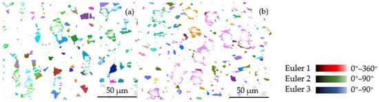 As known, more fine lamellar colonies can be observed at the center and 1/2r of the forged disk. According to the solidification characteristics of the β-γ TiAl alloy, the decomposition reaction α → (α + γ) occurs in the (α + γ) two-phase region, forming the special lamellar colony. As the temperature decreases, the α phase of the A3 structure undergoes an ordered phase transition to form the α2 phase of the D019 structure. The α2 phase retains the orientation of the parent α phase, i.e., in a single (α2 + γ) lamellar colony, the orientation of all α2 phases is the same. Therefore, the orientation change of the α2 phase can directly reflect the change of the lamellar colonies during the forging process. Figure 6 shows the Euler calibration of the α2 phase in the 1/2r and central areas. It can be seen that the α2 phases inside numerous fine lamellae colonies have the same orientation, as shown by the same color in the Euler diagram. This fully demonstrates that the fine lamellae in Figure 4 are residual lamellar colonies of the as-cast microstructure. Meanwhile, the α2 phase inside the residual lamellar colony in Figure 6b exhibits significantly interrupted and coarsened characteristics. Combined with the phase boundary characteristics in Figure 5c, it indicates that under forging-induced severe plastic deformation, the alloy undergoes significant dynamic recrystallization and relatively gentle α2 → γ phase transformation inside the lamellar colony, i.e., coarsening and discontinuity of the lamellae.