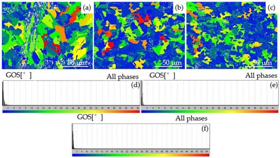 Grain orientation spread maps of the Ti-40Al-6V-1Cr-0.3Ni alloy: (a) edge; (b) 1/2r; (c) core; (d) GOS value at edge; (e) GOS value at 1/2r; (f) GOS value at core.
