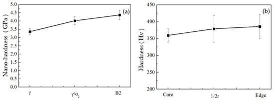 The deformation of multiphase materials at room temperature is influenced by several factors, including grain boundary, adjacent grain orientation, and the internal dislocation slip ability of the grains. The γ and α2 phases of the three-phase TiAl alloy are the first to undergo dislocation slip when subjected to stress. Due to the difficulty of dislocation activation in the B2 phase, dislocation pile-up occurs at the phase interface when dislocations move to the B2 phase, causing stress concentration [39], which cause a drop in the tensile properties [40]. This is the reason that the B2 phase reduces the room-temperature plasticity of the TiAl alloy [41]. Different regions of the forging disk will have different degrees of phase distribution, affecting the hardness of microstructures. Nanohardness measures the hardness of each phase, while microhardness measures the hardness of different microstructures. The correlation between the two experiments makes the experimental results more credible. Figure 8a shows the nanohardness of the lamellar(α2/γ), B2, and γ phases at various stages after forging process. The results show that the nanohardness of the (α2/γ) lamellar, B2 and γ phases are 4.75 GPa, 5.19 GPa and 3.83 GPa, respectively.