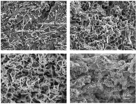 Figure 10 shows the room-temperature and high-temperature tensile fracturing and morphology of the forged Ti-40Al-6V-1Cr-0.3Ni alloy. According to Figure 10a, the tensile fracture at room temperature consists primarily of translamellar, interlamellar, and transgranular fracture features, which represent the typical brittle fracture. Due to the tiny size of the lamellae and the dominance of γ grains, translamellar fracture and interlamellar fracture occupy only a minor fraction of the overall fracture area. Figure 10b–d shows the fracture morphology after high-temperature tensile deformation. The fracture morphology underwent considerable modification, resulting in the appearance of dimples of various sizes. Figure 10b depicts the fracture morphology after testing at 700 °C, which shows a small but dense number of dimples at the fracture surface. A large number of dimples with large size and depth are discovered (Figure 10c), which are typical plastic fracture characteristics, implying significant plastic deformation before fracture at 800 °C. After testing at 900 °C, significant oxidation happens in the fracture, and an oxidation layer covered with a massive number of dense dimples occurs, demonstrating a certain superplasticity deformation.