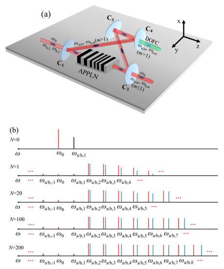 DCDFG, which is stimulated by three input lasers, ω0, ωa,1, and ωb,1, produces two sets of cascaded optical waves ωa/b,m (ω is frequency (cycles/second), m is an integer) and THz waves (ωT1/T2 = ω0 − ωa/b,1), as shown in Figure 1a. ωa/b,m is cascaded Stokes waves with m > 1 and cascaded anti-Stokes waves with m ≤ −1, respectively. The generations of THz waves and cascaded optical waves relate to the pure parametric (second-order nonlinear process) and stimulated Raman scattering processes (third-order nonlinear process) []. The optical parametric oscillator (OPO) for cascaded Stokes waves is a widely used bow-tie resonant cavity [], comprising four cavity mirrors C1, C2, C3, and C4. The concave mirrors C1 and C2 have a high transmittance for ω0, ωa,1, ωb,1, and ωa/b,m (m ≤ −1). The concave mirrors C1 and C2 and the plane mirror C3 have a high reflectivity for ωa/b,m (m > 1), while the plane mirror C4 is partial transmittance for ωa/b,m (m > 1). The nonlinear gain medium is an APPLN crystal.