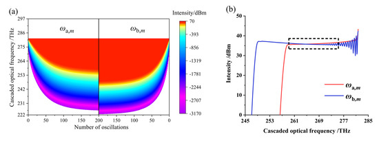 In the process of DOFC generation, the evolution of cascaded optical waves was determined by phase mismatches of DCDFG Δka/b,m. The phase mismatches Δka/b,m were set to be the minimum value from the first-order cascaded difference frequency generation (CDFG) to the mth-order(m 1) CDFG one order by one order, transferring the photons from low-order Stokes waves to high-order Stokes waves. The above setting was achieved by Equation (8):