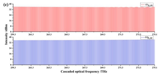 The evolution of DOFC versus oscillation number N is calculated according to Equations (1)–(8), as shown in Figure 2. From the figure, it can be seen that when N < 10, the cascaded Stokes waves transferred to high-order Stokes waves rapidly, and the intensities of the cascaded Stokes waves varied drastically. When 10 < N < 50, the cascaded Stokes waves transferred to higher-order Stokes waves rapidly, and the intensities of the cascaded Stokes waves changed moderately. When 50 < N < 200, the transformation of cascaded Stokes waves to higher-order Stokes waves was slow, and the intensities of the cascaded Stokes waves tended to be stable. When N = 200, the cascaded Stokes waves were converted to a high-quality DOFC, as shown in Figure 2b,c. The repetition frequency difference Δfrep of the DOFC was 200 MHz, the spectrum range of the DOFC within 1 dB flatness was 259.3 THz–275.2 THz, and the number of the comb line was 160.