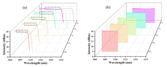 Equations (1) and (2) show that phase mismatches Δka/b,m affected the interaction of cascaded Stokes waves. The interaction length of the mth-order CDFG was ΔLm, and ΔLm = L/m. By changing the crystal length L and keeping cascading order m constant, the variable ΔLm changed the transfer speed of the cascaded Stokes waves to high-order Stokes waves. Figure 4a shows the spectral distribution of DOFC with different crystal lengths L. The DOFC spectrum range of 271–280.1 THz was extremely narrow for L1 = 4 cm. As the crystal length L increased from 4 cm to 4.5 cm, 5 cm, 5.5 cm, and 6 cm, the DOFC spectral range gradually increased and rapidly moved to the long-wavelength range. The DOFC spectrum range was 259.3–275.2 THz for L = 6 cm. As the crystal length increased from 4 cm to 4.5 cm, 5 cm, 5.5 cm, and 6 cm, the comb line number of DOFC within 1 dB flatness increased from 92 to 111, 124, 135, and 160. With the above five crystal lengths, the DOFC spectrum range of 1071.05–1156.96 nm within 1 dB flatness can be achieved. The reason for the above phenomenon is that when the ΔLm was short, the photon transfer from the mth order Stokes wave to the (m + 1)th order Stokes was extremely insufficient, resulting in the narrow DOFC spectrum range. As discussed above, the number of comb lines, the amount of flatness, and the spectral distribution range of DOFC can be tuned by adjusting the crystal length. From Figure 3 and Figure 4, we find that the wide tuning of DOFC spectrum range can be realized by changing the crystal length L, while the precise tuning of the DOFC spectrum range can be achieved by changing the cascading order m.