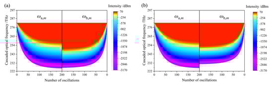 DOFC with different repetition frequency differences Δfrep can be obtained by changing the frequency of ωb,1, while the two frequencies ω0 and ωa,1 are constant. Figure 5 illustrates the DOFC formation process for Δfrep = 300 and 400 MH. It can be seen from the figure that the cascaded Stokes waves firstly rapidly and then slowly transferred to higher-order Stokes waves as the oscillation number N increased. A stable DOFC was formed when N = 200. Comparing Figure 5 with Figure 2, when the repetition frequency difference Δfrep increased from 200 MHz to 300 MHz and 400 MHz, the spectral distribution range of DOFC was reduced from 259.3–280.1 THz to 259.2–268.6 THz and 259.9–266.3 THz, respectively. The reason was that as Δfrep increased, the phase mismatch Δka/b,m of the mth order CDFG was enlarged, resulting in a slow photon transfer from the mth order Stokes wave to the (m + 1)th order Stokes wave.