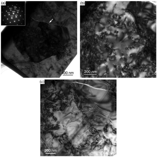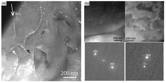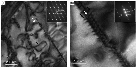 A pair of long and curved dislocations are presented in Figure 3a. The direction of the straight dislocation segment (indicated by the broken black arrow) was [10-1] (u = g111 × g101); thus, the segment had mixed screw and edge characters. The solid black arrow in Figure 3a indicates an intermediate jog at the end of the dipole trail. The jog is almost out of contrast in this figure. A jog is a short edge element of a dislocation that links two slip planes, like a step. Jogs have the same Burgers vector as the dislocation line on which they lie [28]. The dipole trail of the pair of the dislocations was pinned by the jog, which could be observed in the dark-field image with g22-2 taken with two weak beams (Figure 3c black arrow), resulting in a sessile configuration in which the two dislocations could not glide freely. The curved portions indicate increased mobility due to climbing activity at high temperatures [28]. Many curved free dislocations with mixed screw and edge characters can be observed in Figure 3d,e. Some small loops also existed in this grain. Figure 3a shows a small prismatic loop formed by the movement of the dislocation dipole (indicated by white arrow), and Figure 3e shows some dislocation loops that formed from the vacancy (indicated by black arrows). Dislocation walls of twist boundaries composed of arrays of [001] screw dislocations are shown in Figure 3f.