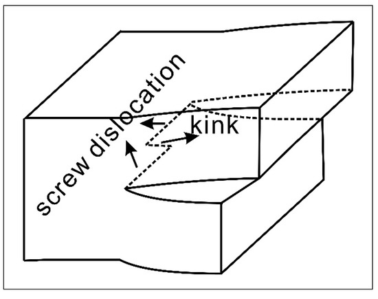 Figure 4a,b show the dislocation structure of another grain. The dislocations were simultaneously out of contrast with g200 and g020, indicating again that [001] was the unique Burgers vector. Figure 4a is a bright-field image with [001] incidence. A line of end-on screw dislocations can be observed in Figure 4a (such as those indicated by the white arrows). This dislocation wall was perpendicular to g100, indicating that its slip system was (100)[001]. The screw dislocation wall was likely an original sub-grain boundary in San Carlos olivine because the sub-grains that are elongated parallel to (100) are frequently reported to exist in natural olivine samples [5,8]. Figure 4b is a bright-field image that shows this dislocation wall in another incident direction [20-1]. In this figure, all of the dislocation lines in the array were folded, indicating the formation of dislocation kinks. Figure 5 is a schematic representation of the formation mechanism of a kink. A kink is also a short element of dislocation with the same Burgers vector as the line on which it lies. However, unlike jogs, a kink is a step in the same slip plane [28]. Commonly, kinks represent a deformation mode found in crystals with few slip planes. When the compression axis is nearly parallel to the slip plane, the slip plane will bend and form sharp kink band boundaries [27]. Figure 4b shows a kink band (marked by the white arrow) in an array of screw dislocations (marked by the black arrows). These kinks are within the same slip plane (100) as the screw dislocations, and, when viewed edge-on, they appear as very short lines in Figure 4a (white arrows).