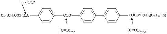 The most promising compounds for practical use in display technology are those with a molecular structure based on that of the MHPOBC liquid crystal; the first published compound with a SmCA* phase [] and with a fluorinated terminal chain. These types of compounds possess the orthoconic SmCA* phase with a tilt angle close to 45°, which enables the good quality of the dark state in LC displays []. The last extensive research showed the significant influence of the molecular structure of such compounds on their physical properties [,,]. For instance, the fluorosubstitution of the aromatic molecular core affects the occurrence of the smectic phases and phase transition temperatures []. In this paper, we analyze the impact of the length of the alkyl chain on the phase behaviour of other MHPOBC-based compounds. This work is dedicated to the liquid crystals belonging to a family of (S)-4′-(1-methyloctyloxycarbonyl) biphenyl-4-yl 4-[‘m’-(2,2,3,3,4,4,4-heptafluorobutoxy) ‘m’alkoxy]-benzoates (where ‘m’ means 3, 5 or 7 methylene groups), abbreviated as 3FmHPhH7 compounds. The general formula of these molecules is presented in Figure 1. These compounds are composed of a partially fluorinated chain, a phenyl and a biphenyl moiety with a -COO- spacer, and a chiral alkyl chain linked by a second -COO- group with a rigid core.