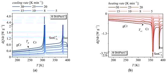 To determine the phase sequence of the 3F3HPhH7 compound, the DSC thermograms are registered with cooling/heating rates in a 5–30 K min−1 range (Figure 2). For all applied cooling rates, we observe an anomaly at approx. 383 K with an enthalpy change of ∆H = 8.6 kJ mol−1 and an entropy change of ∆S = 15.6 J mol−1 K−1 (values for the rate of 10 K min−1), corresponding to the transition from the isotropic phase to the SmCA* phase (Figure 2a). Due to the transition between the highly ordered chiral tilted smectic phase and isotropic phase, the ∆H of the clearing points is relatively high. The next anomaly, at 309 K, is related with the SmCA*—Cr phase transition and it is characterized by very large thermal effects (∆H = 12.6 kJ mol−1 and ∆S = 40.6 J mol−1 K−1, values for the rate of 10 K min−1), Figure 2a. The entropy changes between the crystal and the SmCA* phase is similar to the value obtained for the structurally similar compounds, for which the conformationally disordered (CONDIS) crystal phases were indicated [,,,]. To prove that the Cr phase in the 3F3HPhH7 is the CONDIS crystal type, we characterize the change in entropy of the first order phase transition as: