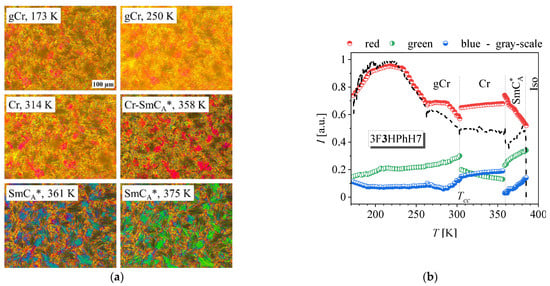To confirm the phase behaviour of the 3F3HPhH7 compound, the representative textures characteristic for a given thermodynamic state are observed using the polarizing optical microscope (Figure 3a). These POM textures can be interpreted by numerical analysis, using ‘rgb’ and ‘gray-scale’ methods (Figure 3b); the procedures are described in []. The first method is useful when during the phase transitions, the POM textures change in colour. The textures collected at 173 K and 250 K upon heating of the sample (after previous fast cooling) belong to the glassy state of the crystal phase. The significant change in the light intensity in the range of 260–270 K may be interpreted as the softening of the gCr state. The occurrence of the local minimum on the ‘gray-scale’ curve is identified as a cold crystallization process. The melting of the Cr phase (the exampled texture is collected at 314 K) is associated with the decrease in the light intensity (with the texture at 358 K). The textures collected at 361 K and 375 K belong to the SmCA* phase. The observed change in colour is caused by the continuous ordering of molecules in the smectic layers. The changes visible in the plots of the thermooptical analysis correlate well with the anomalies on the DSC curves. Comparing both ‘rgb’ and ‘gray-scale’ algorithms, one can see that the ‘rgb’ method provides much more sensitivity than the ‘gray-scale’ approach.