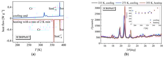 According to the DSC results obtained upon slow cooling/heating with a rate of 2 K min−1, the 3F3HPhH7 compound under the given conditions does not undergo vitrification; moreover, during its cooling, two anomalies related to the crystallization of the sample are visible below 320 K (Figure 4a). The XRD patterns of the compound under study collected upon similar conditions confirm the existence of one crystal phase in this compound; the peak shifts are caused by a change in the unit cell parameters with temperature, and an increase in the intensity of thhe peak upon heating is due to a decreasing number of defects in the crystal phase (Figure 4b).