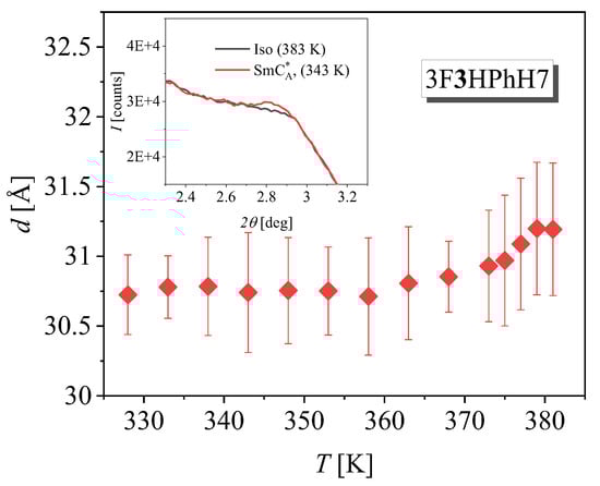 Figure 5 shows the temperature dependence of the smectic layer spacing of the 3F3HPhH7, determined from the position of the low-angle diffraction peak at 2θ ≈ 2.8°, according to the Bragg equation d = 0.5λ/sin(θ) [], where λ = 1.5406 Å is the CuKα wavelength. The low-angle peak is absent in the isotropic liquid phase and in the crystal phase. In the SmCA* phase, the layer spacing slowly increases with temperature, the values of d are in the range of 30.7(4)–31.2(5) Å.