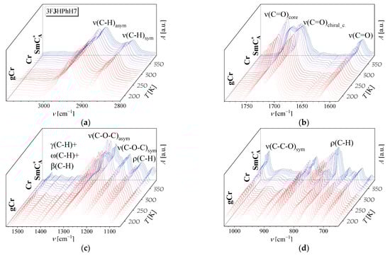 The infrared spectra are analysed to elucidate the changes in the molecular interactions accompanying the phase transitions of the 3F3HPhH7 (Figure 6). The most sensitive bands to changes during the cold crystallization process are bands related with C–H vibrations. The asymmetric (above 2900 cm−1) and symmetric (below 2900 cm−1) C–H stretching vibrations exhibit an increase in intensities and high-wavenumber shift. The change in the band shape is also observed for the bending out of plane and wagging C–H vibrations (between 1500 and 1300 cm−1) as well as rocking C–H mode (at 1100 and 800 cm−1). These effects may be explained by the increase in the short-range order of molecules during the cold crystallization. The Cr–SmCA* phase transition is generally associated with the decrease in intensity for all bands (except the symmetric C–C–O stretching vibrations at 1000 cm−1). In addition, after the transition to the mesomorphic phase, a change in the shape of the rocking C–H band as well as the appearance of a new bending-in-plane C–H vibrations, both related with methyl groups, is observed. The mentioned effects may be caused by partial translational melting and the occurrence of changes in the motional freedom and intermolecular forces [] due to the biggest values of enthalpy and entropy changes in the Cr–SmCA* phase transition.