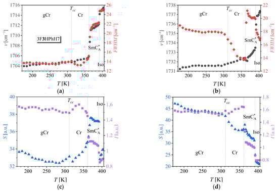 The bands associated with the stretching vibrations of the carbonyl group in the rigid core, ν(C=O)core, and in the vicinity of the chiral centre, ν(C=O)chiral_c., are sensitive to various intramolecular interactions. Due to their good separation from other bands (Figure 6b) and a considerable distance from fluorine atoms, we discuss the vibrational dynamics of the 3F3HPhH7 as variations of these band parameters, e.g., positions ν, full width at half maxima FWHM’s, areas S and intensities I (Figure 7). The mentioned bands are fitted by the Lorentz function. The cold crystallization process is related with the high wavenumber shift of both bands and the increase in I, while the values of FWHM and S gradually decrease. The observed changes may be explained by the sensitivity of carbonyl groups to the short-range order of molecules, which is first built up during the crystallization process. In the Cr phase, an increase in ν is visible for both bands; however, the other parameters behave differently: (i) the FWHM factor shows the minimum for the ν(C=O)chiral_c., while it decreases for ν(C=O)core; (ii) the opposite situation is seen for the I parameter; (iii) the S factor exhibits inflection points at the same temperature, at which the I parameter has the maximum for the ν(C=O)chiral_c.. The slight fluctuations in the parameters of both bands in the crystal phases may result from an incomplete ordering within the crystal structure with the rotation of whole molecules still active. In the SmCA* phase, a sudden growth in the values of all band parameters is registered (only the intensity of the ν(C=O)chiral_c. decreases). The bands are broadened in the mesomorphic phase, as the molecules recover partial rotational and translational degrees of freedom. The C=O groups play a significant role in the discussed phase transitions not only of the 3F3HPhH7, but also for its homologues [,].