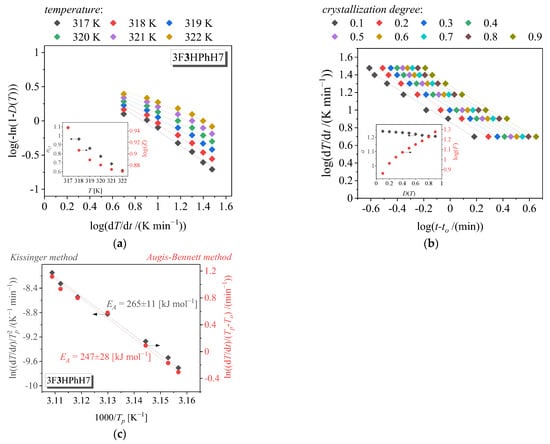 where Tp is temperature corresponding to the maximum of the exothermic anomaly in a thermogram, and To is the initial cold crystallization temperature. Since in the Kissinger and Augis–Bennett plots only one linear dependence is observed, we can assume that for all applied heating rates the mechanism of the cold crystallization is the same (Figure 8c). The value of the activation energy is (265 ± 11) kJ mol−1 for the first model and (247 ± 28) kJ mol−1 for the second. The obtained differences may result from the specificity of the used methods (the Kissinger model is derived for first order reactions, while the Augis–Bennett model is more general). An equally high value of the activation energy was obtained for the non-isothermal crystallization of the ordered crystalline smectic B phase in BBOA compound [].