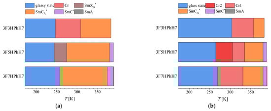 Recent research showed that the phase situation of the 3F5HPhH7 compound upon fast cooling is as follows: isotropic phase (Iso)—389 K—SmC*—380 K—SmCA*—275 K—hexatic smectic SmXA* phase—244 K—gSmXA* state, while slow cooling leads to the melt crystallization (i.e., crystallization observing during cooling) of the sample at 270 K [,]. Upon heating after fast cooling, additionally the cold crystallization process and the melting of two co-existing crystal phases (Cr2 and Cr1) are observed: gSmXA*—265 K—Cr2—305 K—Cr1—335 K—SmCA*—380 K—SmC*—389 K—Iso. The carried out results for the 3F7HPhH7 compound reveal three enantiotropic smectic phases: SmA, SmC* and SmCA* []. Upon fast cooling, the SmCA* phase vitrifies: Iso—390 K—SmA—388 K—SmC*—374 K—SmCA*—259 K—gSmCA* state. Additionally, the broadband dielectric spectroscopy (BDS) measurements show the existence of two glass transitions at Tg,1 = 259 K and Tg,2 = 239 K []. The melt crystallization upon slow cooling is observed at 286 K. The phase behaviour upon heating after fast cooling is as follows: gSmCA*—269 K—Cr—331 K—SmCA*—380 K—SmC*—389 K—SmA—390 K—Iso.