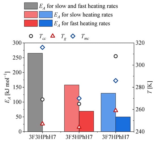 The activation energies (bar plot) and the temperatures of the non-isothermal cold crystallization (scatter plot) of 3FmHPhH7 homologues obtained for slow and fast heating rates.