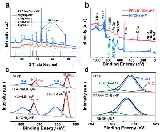 (a) Typical XRD patterns of Ni(OH)2/NF and FFA-Ni(OH)2/NF. (b) XPS spectra of FFA-Ni(OH)2/NF (red) and Ni(OH)2/NF (blue). (c) Ni 2p and (d) O 1s spectra of FFA-Ni(OH)2/NF and Ni(OH)2/NF.