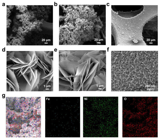 SEM images of Ni(OH)2/NF (a,d), FFA-Ni(OH)2/NF (b,e), and Ni/FFA(OH)2/NF (c,f). (g) SEM image and EDX elemental mappings of FFA-Ni(OH)2/NF.