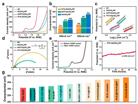 (a) LSV, (b) overpotential, (c) Tafel, and (d) EIS of FFA-Ni(OH)2/NF, Ni(OH)2/NF, Ni/FFA(OH)2/NF, and NF. (e) LSV of FFA−Ni(OH)2/NF before and after 10,000 CV cycles. (f) The chronopotentiometry (CP) test at 200 mA cm−2 of FFA-Ni(OH)2/NF in 1 M KOH solution. (g) Comparison of the overpotentials of the catalyst in this work and the previously reported Fe-Ni-based OER catalysts.
