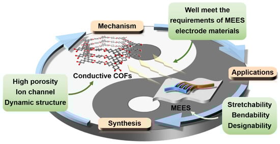 Herein, we first focus on the exploration of conductive COFs (c-COFs) in the field of electrical conductivity. Then, the mechanism and explanation of the effect of synthesis on electrical conductivity enhancement are discussed, which emphasizes the range and suitability of c-COFs in MEESs. Finally, the excellent performance characteristics of c-COFs are demonstrated from the MEES perspective, with key points and potential challenges addressed. This review also predicts the direction of development of c-COFs in the future.