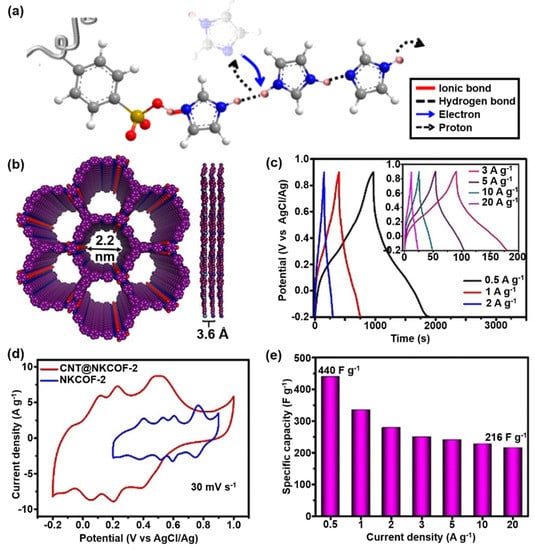 Grotthuss transfer strategy has positive effects on electrochemical performance. (a) Schematic illustrations of the Grotthuss transport mechanisms []. Copyright 2014, American Chemical Society. (b) Simulated structure of NKCOF–8. (c) Galvanostatic charge-discharge curves of CNT/NKCOF–2 at different current densities. (d) CV curves of NKCOF–2 and CNT/NKCOF–2 at a scan rate of 30 mV s−1. (e) Specific capacities of CNT/NKCOF–2 at different current densities []. Copyright 2021, Wiley-VCH.