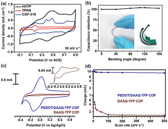 Electrochemical performance enhancement via the post synthetic modification strategy. (a) CV curves of COF–316, HHTP, and TPAN at the scan rate of 30 mV s−1. (b) The capacitance retention curves of COF–316–1@PPy FTCEs under various bending angles of 0°, 45°, 90°, 120°, 135°, 150°, and 180° at 50 mV s−1. Inset: The photograph and sketch map of the TFSCs under bending []. Copyright 2021, Wiley-VCH. (c) CV response at 20 mV s−1 in 0.5 M H2SO4 of a PEDOT-modified DAAQ–TFP film, 1 μm-thick (blue), and the same as-synthesized DAAQ–TFP film before EDOT polymerization (red). The inset presents the cyclic voltametric response for the unmodified film using an expanded current scale. (d) The integrated charge associated with the oxidative wave of a PEDOT-modified DAAQ–TFP COF film (blue) and unmodified DAAQ–TFP COF film (red) recorded over various scan rates indicate that the PEDOT-modified films store more charge and tolerate faster scan rates than the unmodified films []. Copyright 2016, American Chemical Society.