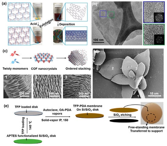 Specific COF structures can be constructed via different synthesis strategies. (a) Overview of the acid-exfoliation and film-casting procedures. (b) HRTEM image of an exfoliated BND–TFB COF sheet []. Copyright 2019, Wiley-VCH. (c) Schematic illustration of employing twisty monomers to achieve ordered stacking for producing long-range ordered COF assemblies. (d) FESEM images of flower-shaped TAPA–TFPA COF assemblies at different scales []. Copyright 2021, American Chemical Society. (e) Solid-vapor IP for the TFP–PDA membrane, including membrane growth and HF etching step to obtain free-standing membrane []. Copyright 2020, American Chemical Society.