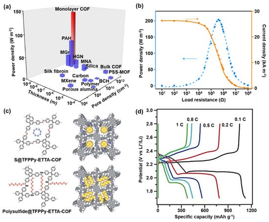 Enhancement of electrochemical performance by good pore structure and aligned channels. (a) Comparison of the osmotic power-generation performance of the COF monolayer membrane with state-of-the-art results from the literature in terms of membrane thickness, pore density and output power density. (b) Current density and output power density dependence on the external load resistance on mixing artificial seawater with artificial river water []. Copyright 2022, Springer Nature. (c) Physical isolation of sulfur (S8 ring) in the COF and covalent engineering of polysulfide chains on the pore walls. (d) Charge-discharge curves of polysulfide@TFPPy–ETTA–COF at different rates []. Copyright 2019, The Royal Society of Chemistry.
