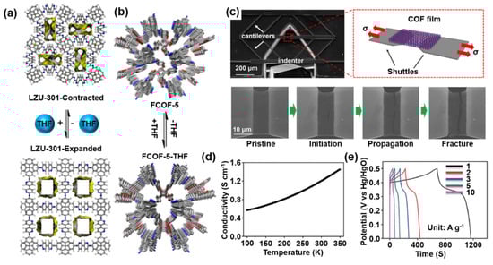 Optimization of dynamic structure, mechanical properties, and electrochemical activity for MEES devices. (a) Schematic illustration of the transformation into the expanded structure presented in LZU–301 []. Copyright 2017, American Chemical Society. (b) Reversible crystal structures transformation between FCOF–5 and FCOF–5–THF []. Copyright 2021, American Chemical Society. (c) SEM image and schematic for uniaxial tension of nano-mechanical devices (above). In situ tensile snapshots of the COF film with the whole process of crack propagation (below) []. Copyright 2021, Elsevier Inc. (d) Variable-temperature van der Pauw conductivity measurement. (e) GCD curves at different current densities (1–10 A g−1) []. Copyright 2019, The Royal Society of Chemistry.