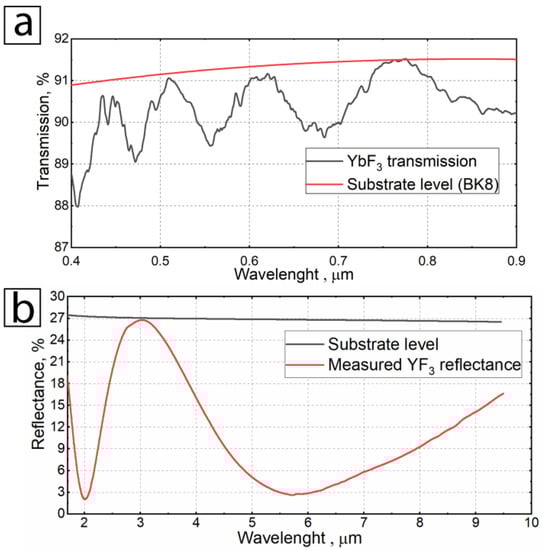 (a)—transmission spectrum of an YbF3 monolayer on a BK8 substrate; (b)—reflection spectrum on a ZGP substrate.