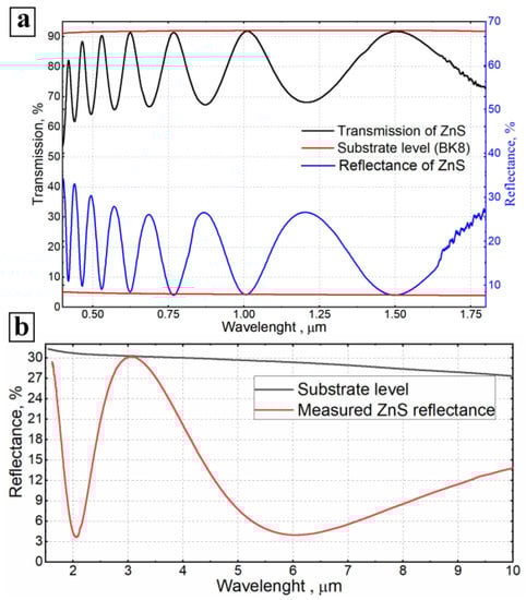 Figure 3a,b shows the reflection spectrum of a ZnS monolayer on a BK8 substrate and a mono crystalline silicon substrate in the range of 0.4–10 µm.