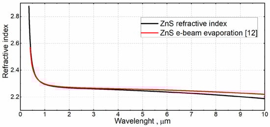 The characteristic of refractive index dispersion of a ZnS monolayer also agrees with the literature data [,,,]. The refractive index of the film deposited by the IBS method is slightly lower (Δn ≈ 0.2) than that of the films obtained by the IAD and thermal evaporation methods. The absorption dispersion of the ZnS monolayer was determined only for visible and near IR spectrum. Strong absorption in the film begins only in the visible range at wavelengths shorter than 600 nm. In the mid-IR range from 1 to 10 µm, the film absorption was not determined due to the absence of correct measurements of transmission. Therefore, only dispersions of the refractive indices were determined for the films, which were subsequently used to calculate the target coating.