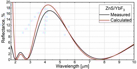The red curve indicates the spectral reflection characteristics calculated in the Optilayer software environment. The target operating ranges of the coating for which the calculation was made are 2097 nm, 2800–3000, and 7500–8000 nm. The black curve in the figure indicates the measured spectrum of the obtained coating on the ZGP substrate. There are differences between the theoretical curve and the measured reflection spectrum, due to the absence of a quartz sensor for controlling the layer thickness in the spraying machine. The coating thickness is controlled only by the optical method and introduces an error when spraying the layer. This error can be summed up, and the finished coating has distinctions from the theoretical spectrum. It is also possible that there is an error in determining the refractive index of the materials used, and, consequently, the difference between the calculated characteristics of the coating and the real one. This error can occur, among other reasons, due to the fact that the measurement of the refractive index takes place in air, and the deposition in the chamber is in vacuum. Also, this error can be caused by the fact that the determination of the refractive index was made only by reflection in the IR region of the spectrum. There is also a slight difference in the absolute value of the reflection value of the measured film characteristic compared to the calculated one. We attribute this to the residual reflection from the second face of the sample, since it was matted with a finely dispersed grinding powder with a grain size of about 5 μm.