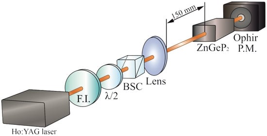 The scheme of the experimental setup is shown in Figure 6. The measured diameter of the focused spot of the Ho3+:YAG laser radiation at the input aperture of the test sample in all experiments was d = 350 ± 10 µm at the e−2 level from the maximum intensity. The power of the incident laser radiation was changed using an attenuator consisting of a half-wave plate (λ/2) and a Glan polarization prism (BSC). A Faraday insulator (F.I.) was used to prevent reflected radiation from entering the laser, which prevented uncontrolled changes in the parameters of the affected radiation. The average power of the laser radiation (Pav) was measured before each experiment with an Ophir power meter (P.M.).