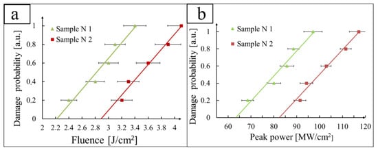 Dependence of the optical breakdown probability of samples No. 1 and No. 2 on the energy density of the incident laser radiation—(a); and on the power density of the incident laser radiation—(b).