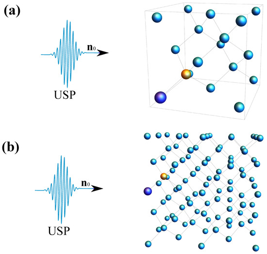 where at and ; , where the f function defines the USP profile, then we get is the Fourier transform of the function . The electron density of such atoms , where are constant coefficients defined in [27]. The result is a simple expression for . Next, we need to determine the form of the incident USP, which we choose as a Gaussian form , where , . We have chosen the shape of the pulse as a Gaussian, since such a pulse is one of the best known for describing the shape of USPs. Indeed, for example, in [28] a subcyclic pulse beam (SCPB) was studied and its exact solution was found. If we consider a special case of this solution, i.e., () then the solution takes the form of just a Gaussian pulse. Performing the calculations with the selected USP we obtain that . We will be interested in the most interesting case of multi-cycle momentum, i.e., when , which is mainly used in diffraction analysis of matter. Using Equation (2) we obtain