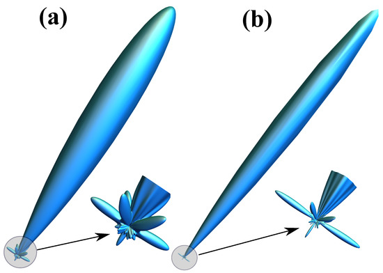 The figures show the contribution to the scattering spectra of a diamond lattice with one NV centre (the parameter above is calculated) as 2D contour plots: (a) the diamond unit cell with NV centre (see Figure 1a), (b) this on the diamond structure presented in Figure 1b. The calculation was done using Equation (3). The angles and are represented in a spherical coordinate system, where the z axis is directed upwards and y is in the direction of the incident USP.
