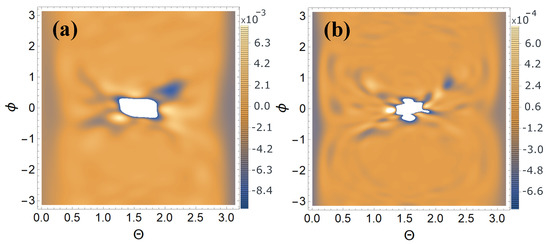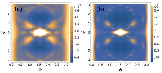 The figures show the 2D USP scattering spectra presented as contour plots: (a) the diamond unit cell with NV centre (see Figure 1a), (b) this on the diamond structure presented in Figure 1b. The calculation was done using Equation (3). The angles and are represented in a spherical coordinate system, where the z axis is directed upwards and y is in the direction of the incident USP.